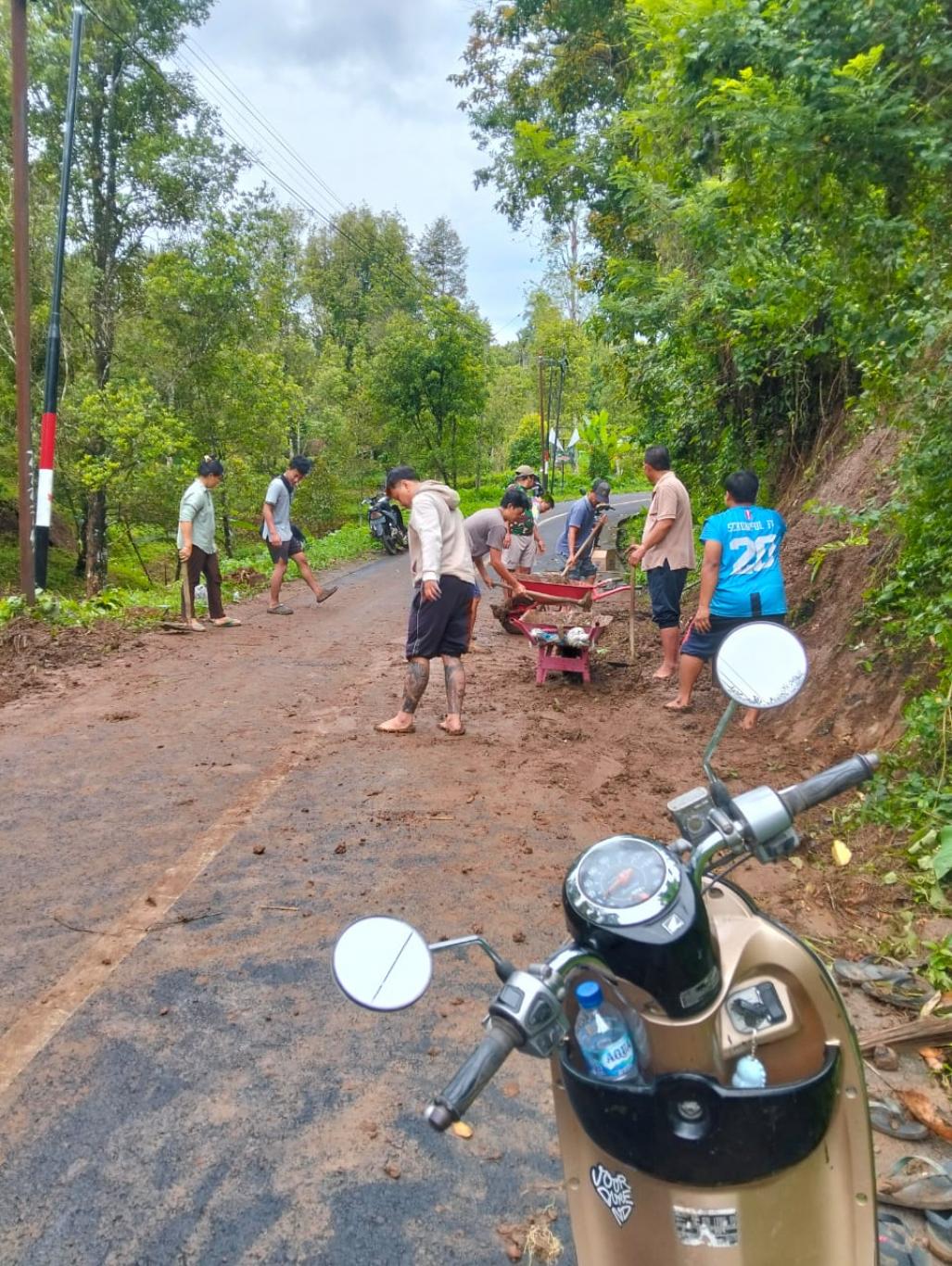 Longsor terjadi akibat curah hujan deras yang turun pada sore hingga malam hari kemarin, yang menyebabkan material tanah, batu, dan lumpur terbawa ke badan jalan. Dalam pelaksanaannya, warga bersama jajaran Pemerintah Desa bahu-membahu membersihkan material longsor menggunakan peralatan yang tersedia.